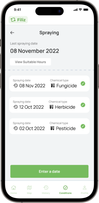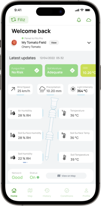 Filiz is an IoT sensor station that monitors soil and weather conditions in your field. Our agricultural sensors measure soil temperature and moisture, provide tailored recommendations for optimizing irrigation, assess disease and frost risk, and determine the most appropriate spraying times. Deploy Filiz agriculture sensors to enable informed decision-making in the field.